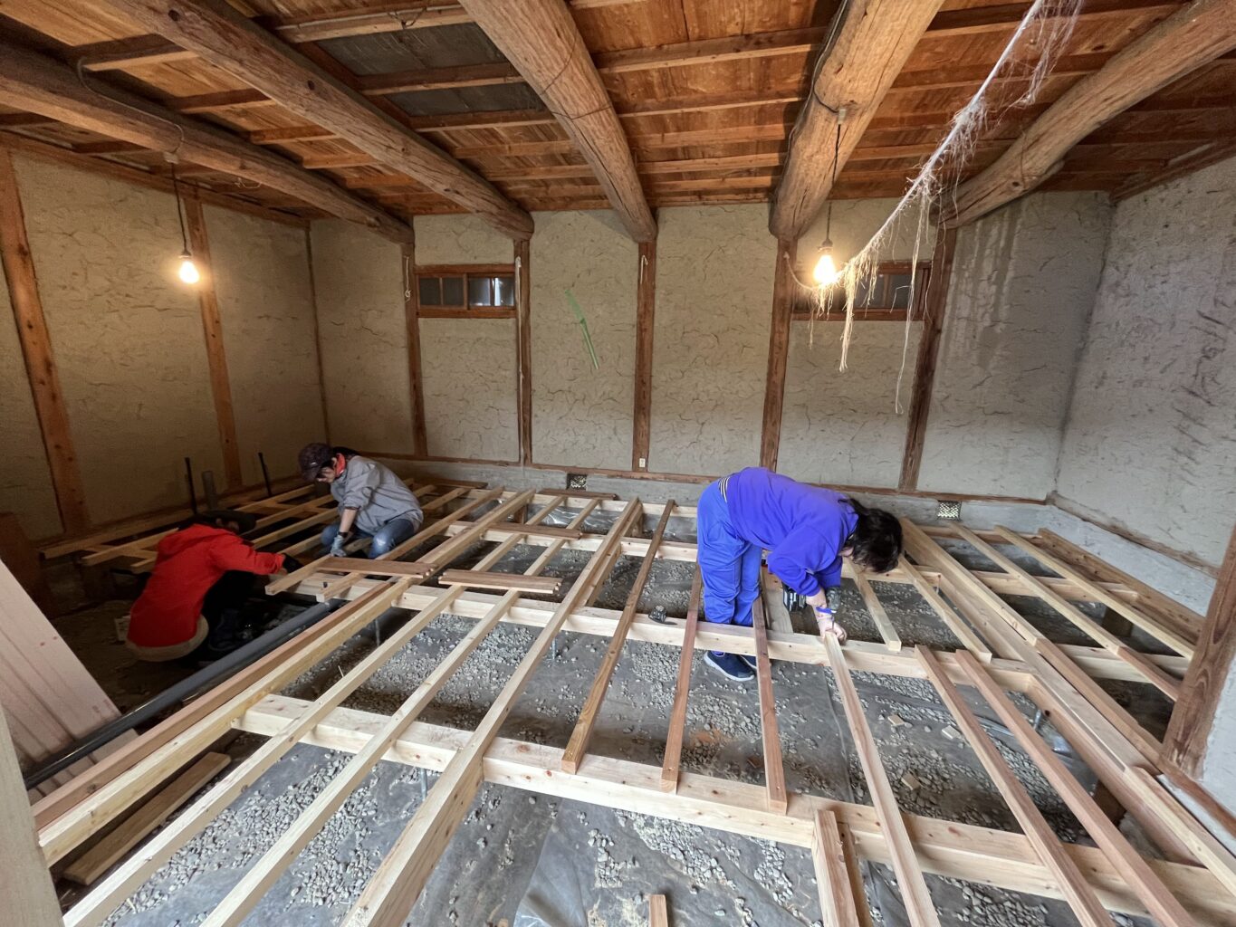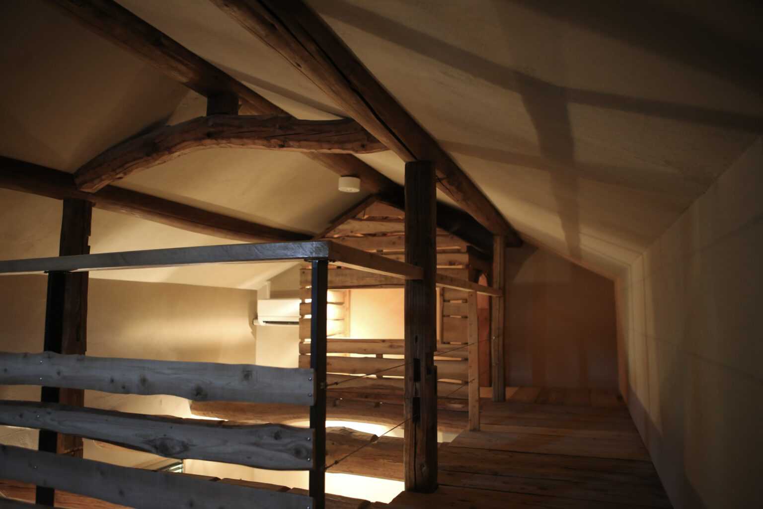 農機具置き場だった頃の面影は、今も随所に残されています。みかん箱を利用した収納や、梁に刻まれた古い傷跡。そうした痕跡をあえて残しながら、新しい家具や調度を迎え入れました。ベッドやソファは大工による造作、そのほかはアンティークショップから調達し、過去と現在の時間を同じ部屋で味わえるようにしています。