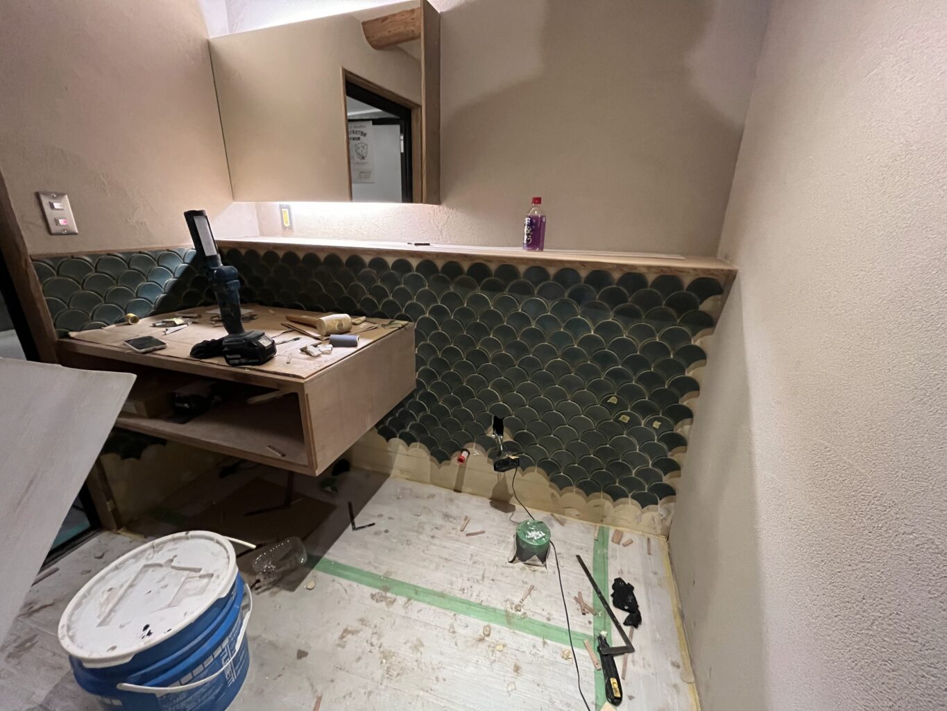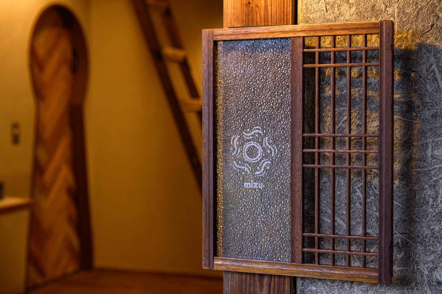 水紋のようにきらめく照明、蛇口をかたどったオブジェ、前方後円墳をモチーフにした洗面所の扉など、遊び心を織り込んだ意匠も散りばめられています。