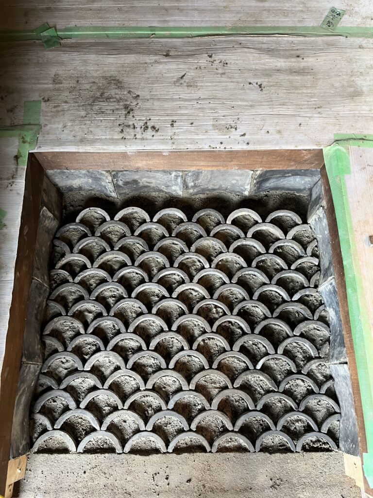 もともとは、みかん農家さんの農機具小屋。梁をそのまま残し、屋根裏の空間を活かしてロフトを設けました。階段には小屋にあったハシゴを再利用し、古いものの記憶と新しいデザインを融合させています。玄関アプローチには青海波模様の瓦をリサイクルし、まるで水紋が揺れるような景色でお客様を迎えます。
