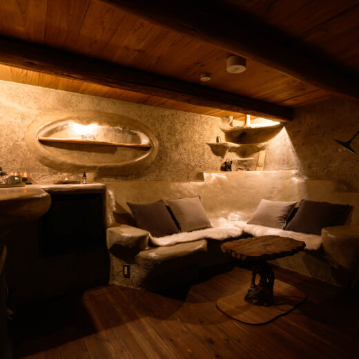 ロフトには、羽毛を使った手作りのブルーソファーと、ツリーハウスのような籠り部屋があります。まるで子どもの頃に戻ったように、無邪気に遊ぶような時間が過ごせます。