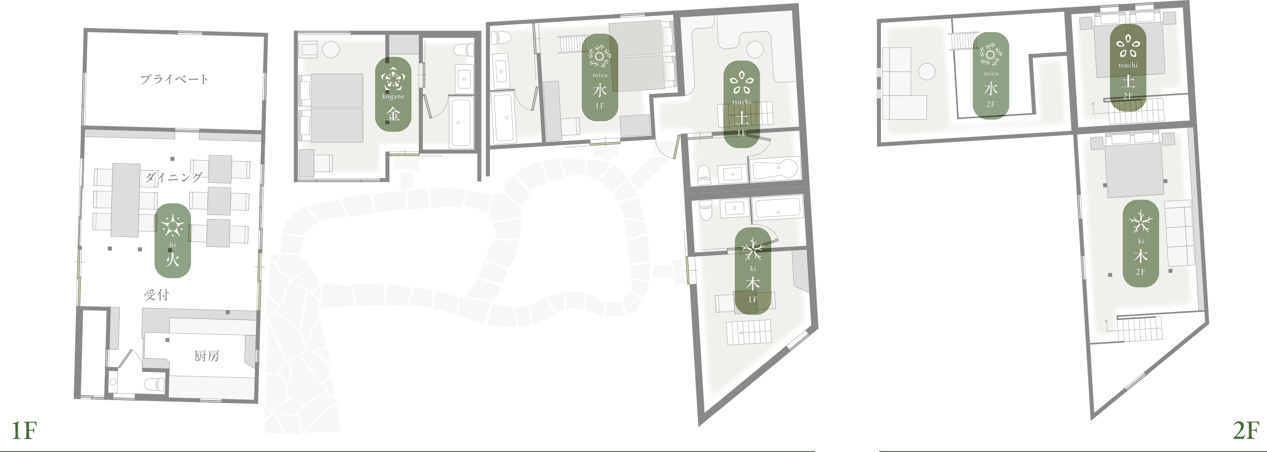 cofuniaの宿泊棟と食堂棟は、古代中国の思想「陰陽五行」に着想を得て、「木・火・土・金・水」の五つのエレメントをテーマにデザインされています。気分に合わせてお部屋をお選びください。